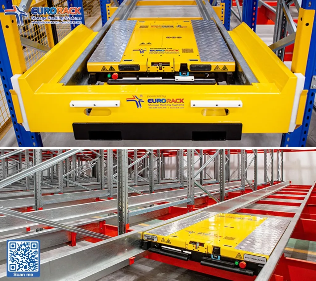Also known as the Eurorack Orbiter, the system combines high-density racking with rail-guided robotic shuttles. Controlled remotely via WiFi, the shuttle can operate continuously for more than 10 hours using lithium batteries. With a load capacity of over 1,500 kg per pallet, it adapts to diverse storage needs, including ambient and cold storage environments from –30°C to +55°C.