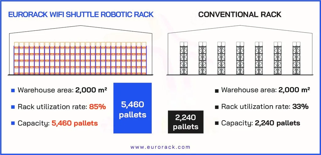Within the same 2,000 m² area, the Eurorack Wi-Fi Shuttle robotic rack increases storage capacity by more than 2.4 times compared to conventional racks (from 2,240 to 5,460 pallets). |