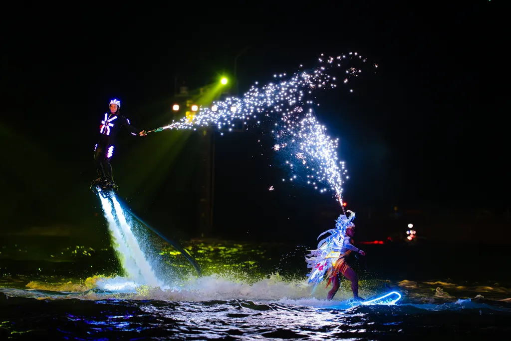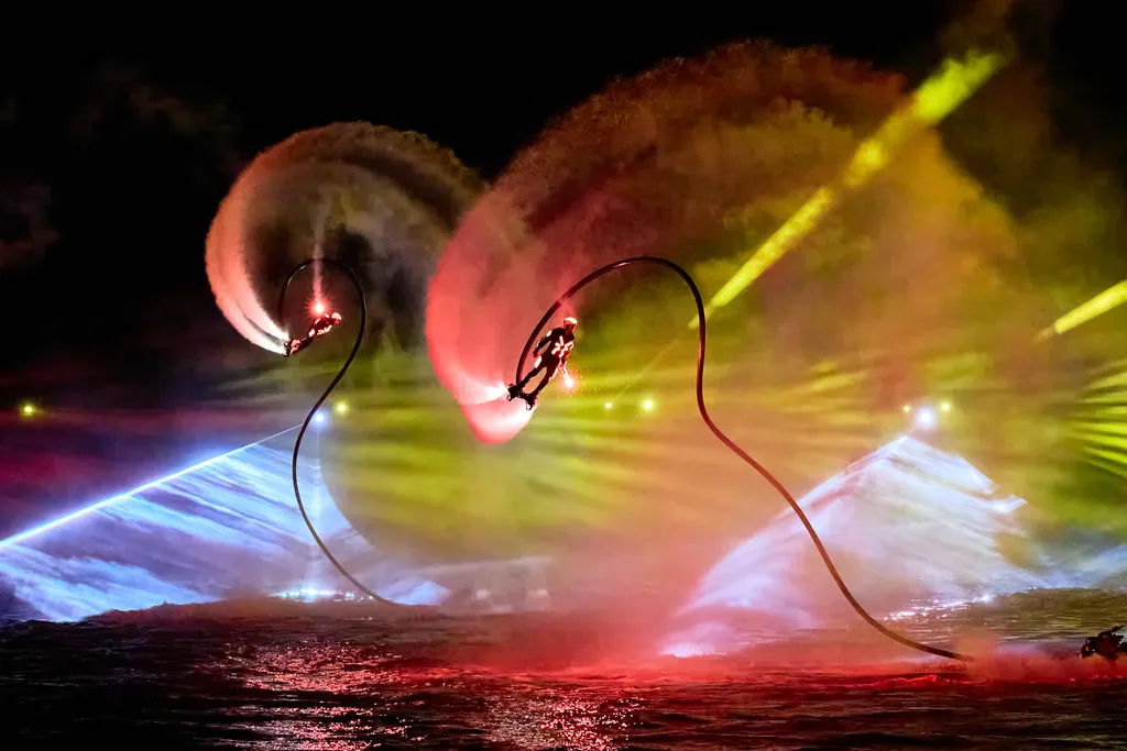 The show is choreographed and performed live on an open-water stage spanning more than 50,000 square metres. Drawing inspiration from the legend of the Cat Ba crane fairy and the Five Elements philosophy in Eastern culture, it features international athletes performing in tightly synchronised formations using jetski, flyboard and jetsurf. These demanding extreme sports are precisely timed to music, lighting, fireworks and laser effects, creating a rare artistic feat within Việt Nam’s live performance landscape.
