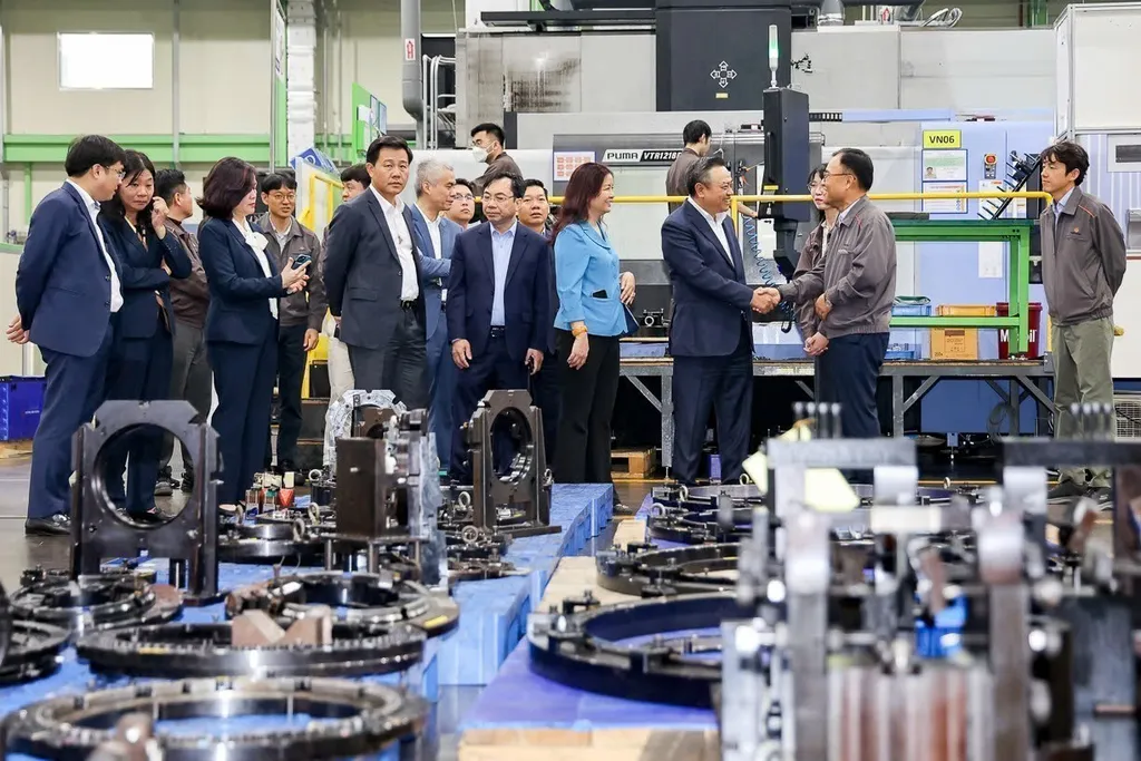 | The Chairman of the Hanoi People's Committee, Trần Sỹ Thanh, visited the Hanwha Aero Engines plant. — VNA/VNS Photo |
