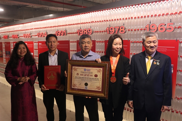 TÂY NINH — Coca-Cola Beverages Vietnam had set a Vietnamese record recognised by the Vietnam Record Organisation (VietKings) for its artwork made of six curved walls using 100,000 recycled PET (rPET) bottles with a capacity of 300ml (excluding caps and labels) on December 9 at the Coca-Cola factory in Tây Ninh Province.