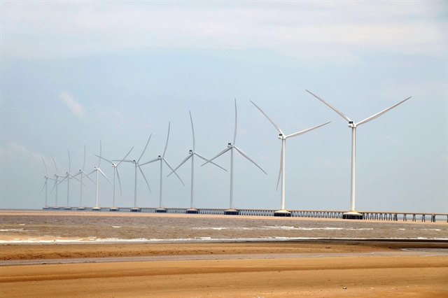 | Wind turbines operate along the coastline of Trường Long Hòa Ward in Vĩnh Long Province. — VNA/VNS Photo Chương Đài |