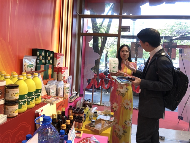 | A staff member introduces her company’s food products to a visitor at an event in HCM City. — VNS Photo Xuân Hương |