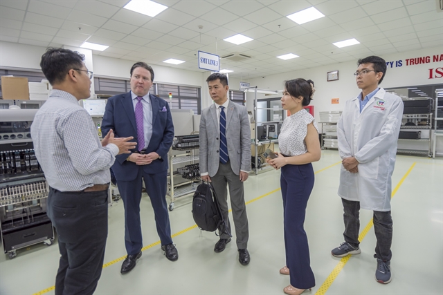 | US ambassador to Việt Nam Marc Evans Knapper (second left) visits an electronic manufacturing factory of Trung Nam Group at Đà Nẵng IT Park. Đà Nẵng urged investment and co-operation from the US partners in hi-tech industries, semiconductor&AI. Photo courtesy of Quang Huy |