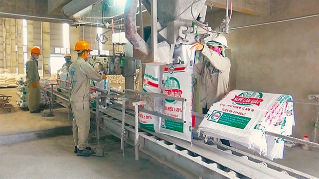 | Workers are packing fertiliser products at a plant of Duc Giang Chemicals. The company's shares plunged nearly 4.7 per cent on Thursday, weighing on the market's sentiment. — Photo ducgiangchem.vn |