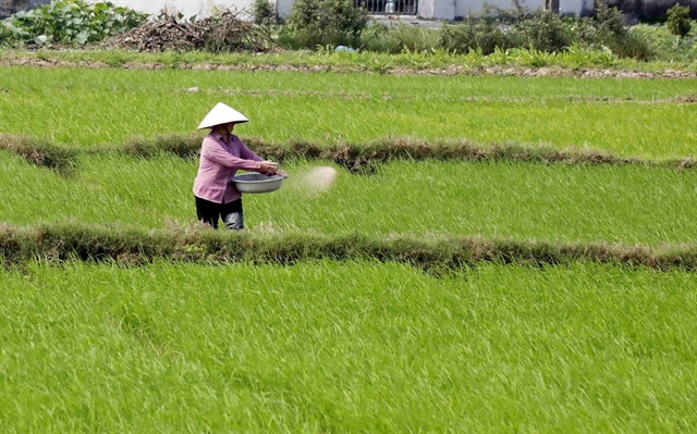 | A farmer in Ninh Bình Province fertilises her winter-spring rice crop. VNA/VNS Photo |
