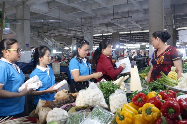 | Women’s Union members urge market vendors in the southern province of Vĩnh Long to switch to biodegradable bags. |
