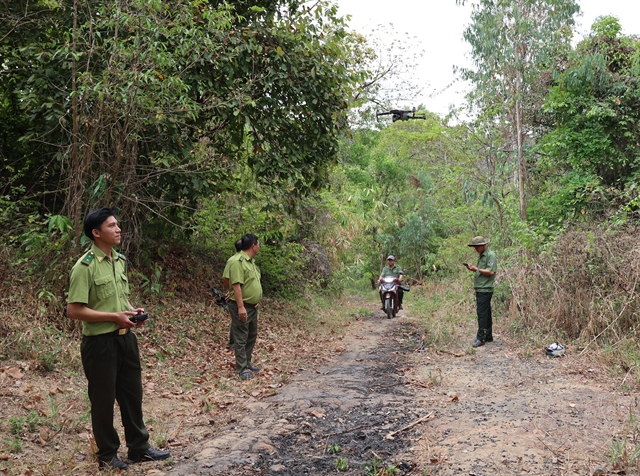 | Rangers from the Phú Mỹ Forest Protection Unit in HCM City use a flycam to monitor the forest, quickly detecting any fires. — VNA/VNS Photo Hoàng Nhị |