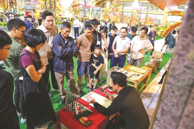 | People at a calligraphy booth. VNA/VNS Photo Khánh Hòa |