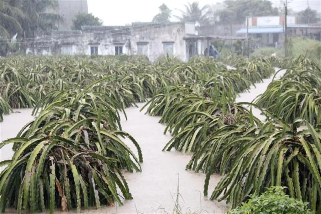 | Large areas of dragonfruit fields in Hàm Liêm Commune were submerged in floodwater. |