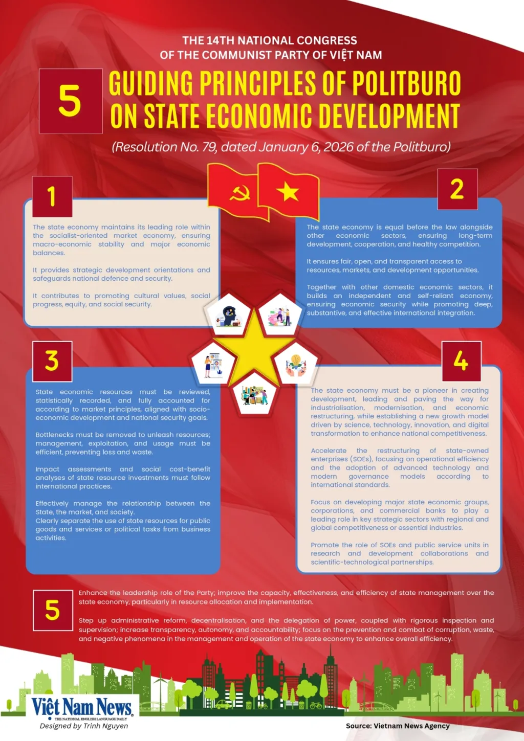 Outlined in the Politburo’s Resolution No. 79 dated January 6, 2026, the five guiding principles define the role of the state economy within the socialist-oriented market economy, stressing macroeconomic stability, fair competition, equal treatment under the law and sustainable, long-term development.