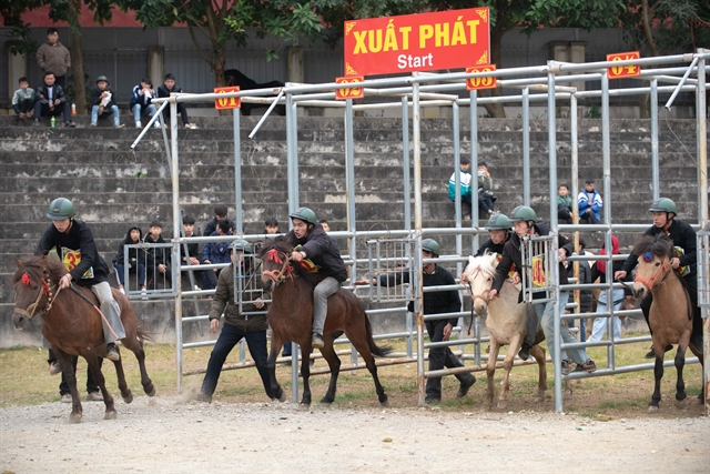 | Riders urge their mounts forward the instant the starting gates swing open, launching into a sprint. VNS Photo Bảo Long |