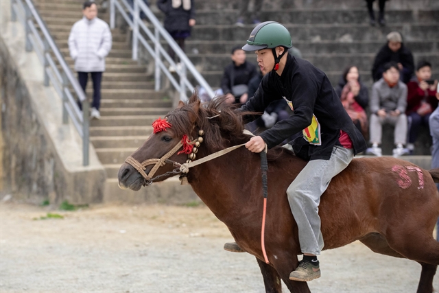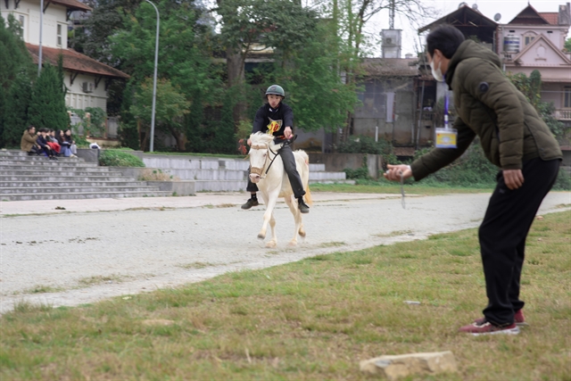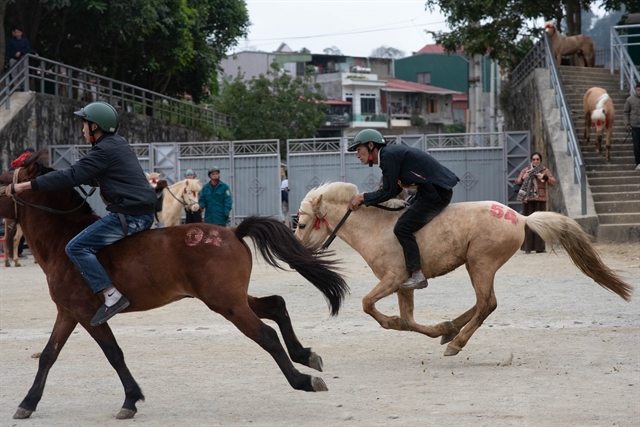 | Horse racing in Bắc Hà is "barebone racing," where riders ride horses without saddles or stirrups, using only a harness and two iron hooks attached to ropes on either side of the horse's jaw for control. VNS Photo Bảo Long |