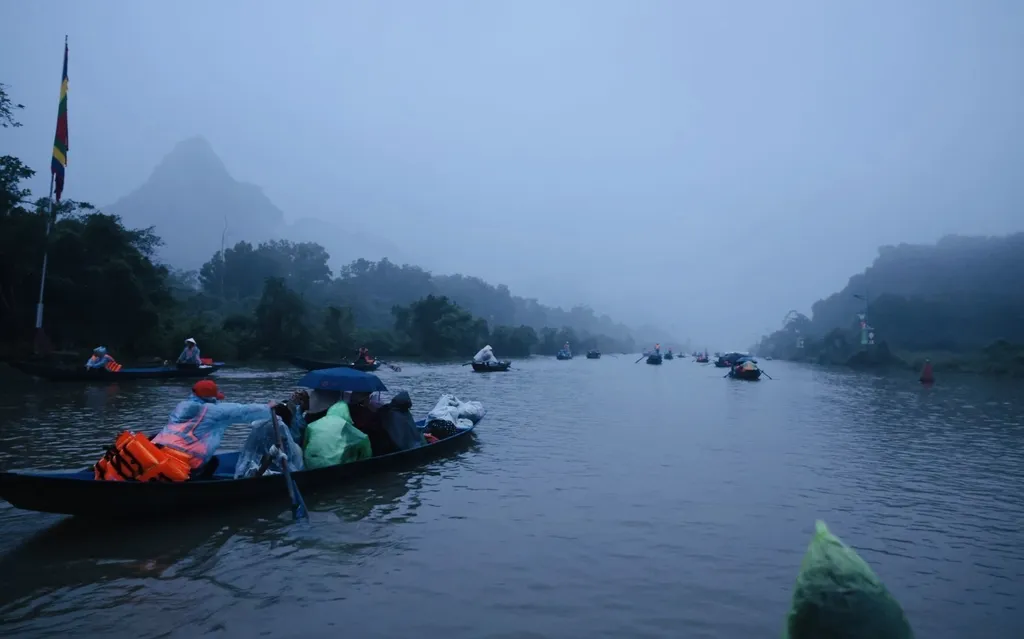 | Festival-goers travel by boat along Yến Stream en route to the Hương Pagoda complex. |
