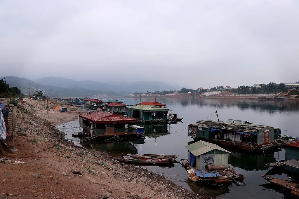 | Boats and floating homes near Bridge No. 3 are now anchored further from the bank due to the receding water. |
