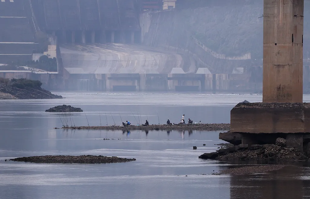 The sharp drop has transformed previously submerged sections of the river into wide sandbanks visible from above.
