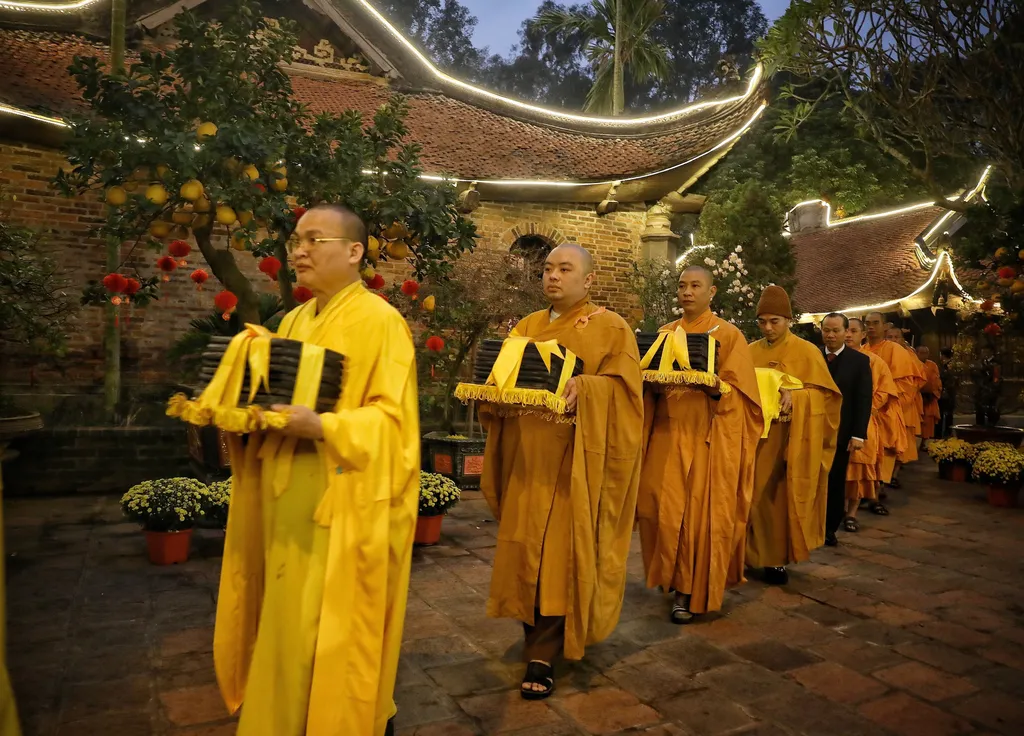 | A ritual procession carries the woodblocks to Tây Yên Tử, highlighting their spiritual significance. |