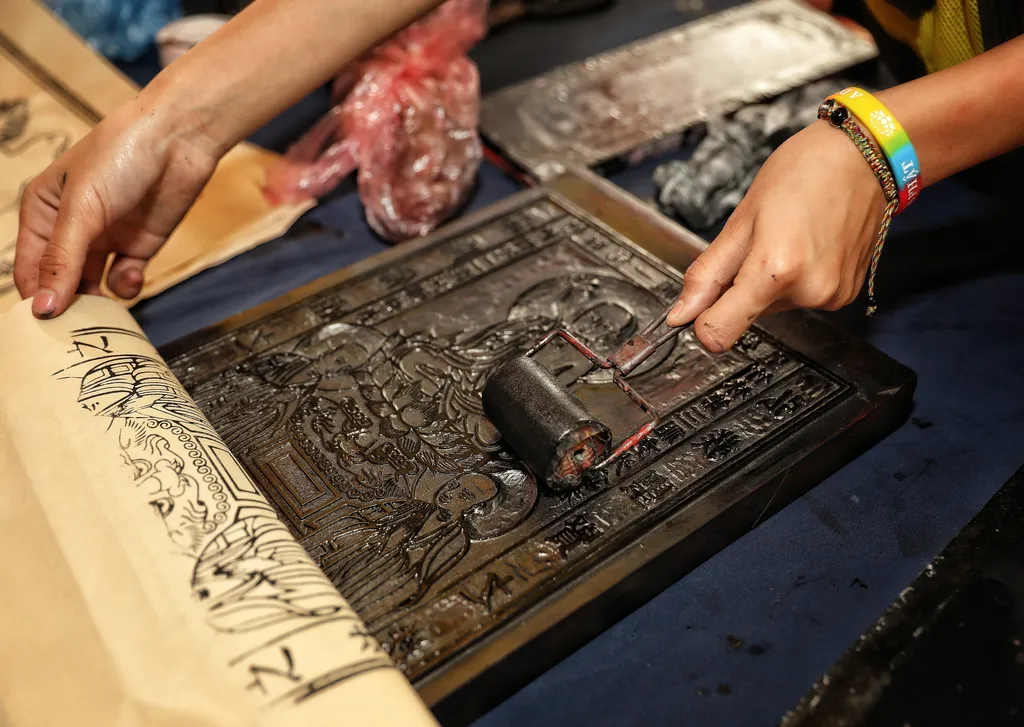 | Students experience the woodblock printing process, connecting with heritage through practice. |