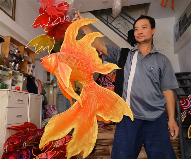 | Artisan Nguyễn Trọng Bình holds a golden fish-shaped lantern at his workshop in the Phú Bình lantern-making craft village in Hồ Chí Minh City. Photo baotintuc.vn |