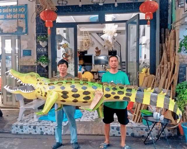 | Cultural researcher Trịnh Bách (left) and artisan Nguyễn Trọng Bình with a lantern design at the Phú Bình lantern-making craft village in Hồ Chí Minh City. Photo tcdulichtphcm.vn |