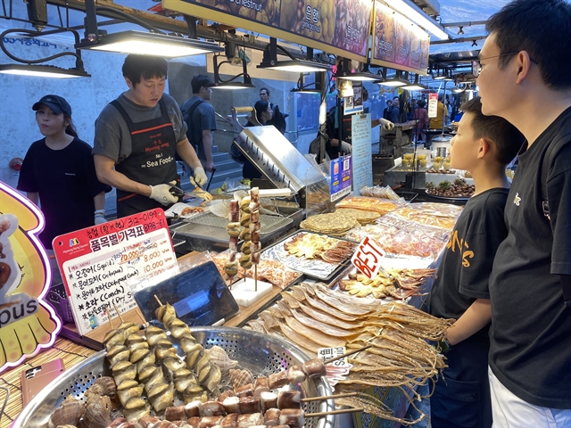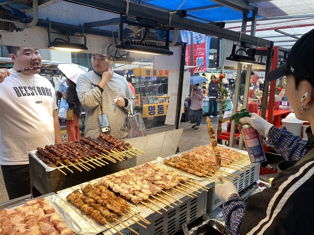 Shoppers can find nearly all of Korea’s most popular street foods, such as grilled squids, chicken and pork. |
