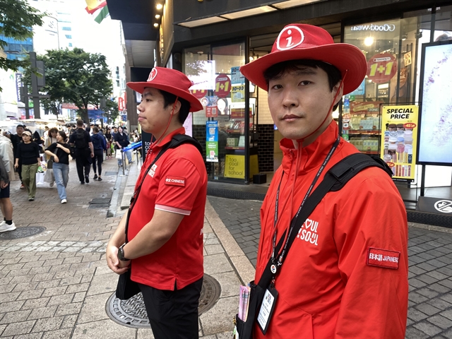 On bustling street corners, staff members stand ready to guide tourists, offering information in several languages, including Chinese and Japanese. |