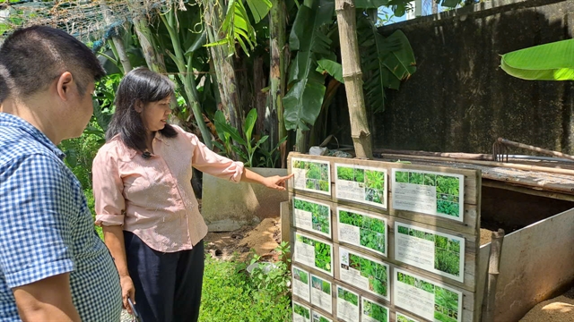 EMIC Travel Manager Nguyễn Thị Thanh Thủy introduces a kitchen waste treatment facility in the Field Restaurant's garden. VNS Photo Công Thành |