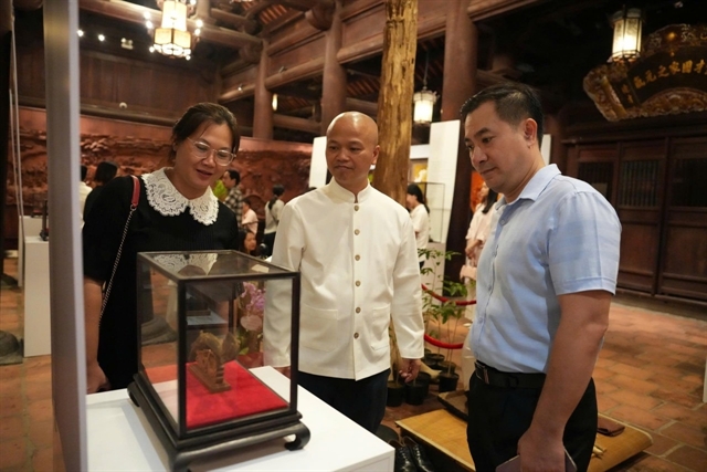 Visitors view an agarwood artwork displayed at the event. — Photo courtesy of the Centre for Cultural and Scientific Activities – Văn Miếu – Quốc Tử Giám |