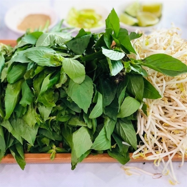Fresh herbs and fresh green bean sprouts are among the ingredients used to make burnt liver noodle soup. Photo dienmayxanh.com |