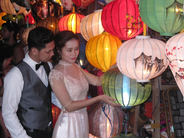 | A wedding couple check a lantern shop in Hội An ancient town. The world heritage site is decorated by lanterns every night. VNS Photo Công Thành |