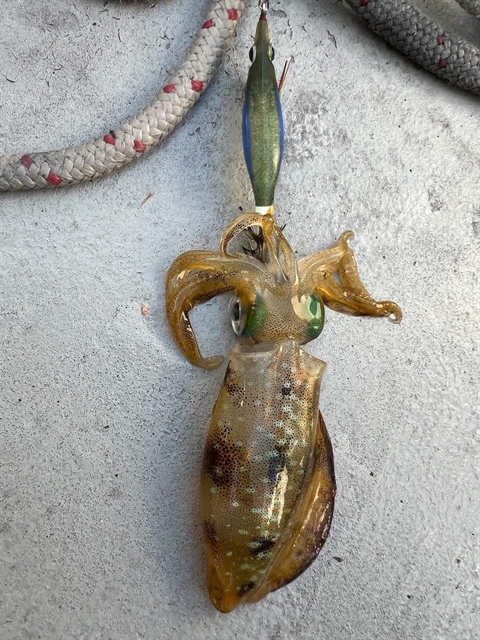 At first, I pull up nothing. The others chuckle kindly. Then, suddenly, a strong but quick tug – a squid! It thrashes wildly, spraying ink across my arm as I lift it aboard.