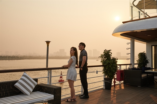| Tourists watch the sunset on the Red River on a luxury cruise ship. — VNA/VNS Photo |