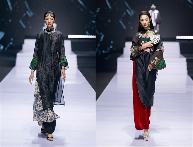 The collection features silk áo dài (Vietnamese traditional dress) in black, which are decorated with colourful brocade fabric woven by ethnic minority groups in northern mountainous areas. They are also embroidered with folk patterns such as flowers, birds and dragons.