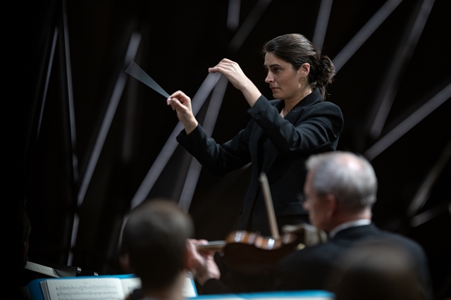| Conductor Sophie Deẻvaux, the first female conductor to appear on the Hồ Gươm Theatre stage. |