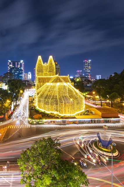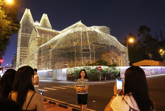 | From now until January 5, 2026, an LED lighting system totalling 1,000km in length will illuminate Sài Gòn Notre Dame Cathedral from 6:45pm until 2am. — Photo tcdulichtphcm.vn |