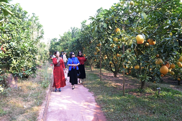 | Tourists visit the pomelo orchard of Nguyễn Văn Hữu in Chũ Ward, Bắc Ninh Province. |