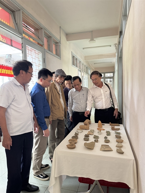 | Aftefacts excavated from an entrance road of the Mỹ Sơn Sanctuary are on display at a conference on the report of the excavation on the road. Photo courtesy of Công Khiết |