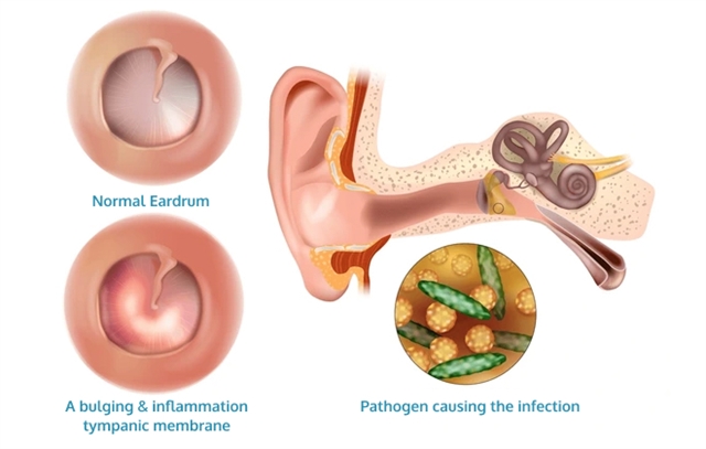 | Normal eardrum vs. inflamed tympanic membrane and infection. Photo courtesy of Avisena Women’s & Children’s Specialist Hospital |