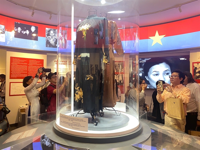 | Two áo dài worn by Nguyễn Thị Bình during the signing of the Paris Peace Accords are part of an exhibition on her at HCM City’s War Remnants Museum. — VNS Photo Quốc Phong |
