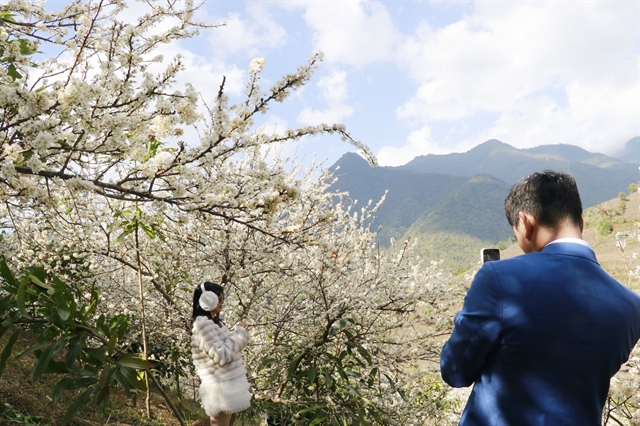 | Tourists photograph plum blossoms in Púng Luông. — VNA/VNS Photo Đinh Thùy |