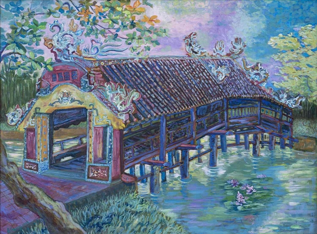 | Sunset on Thanh Toàn Tile Bridge, oil on canvas by Lê Trang. |