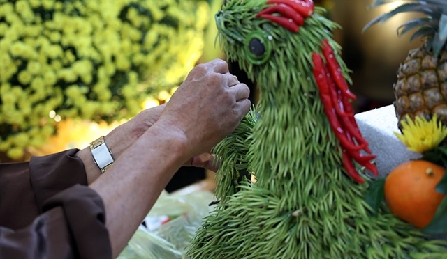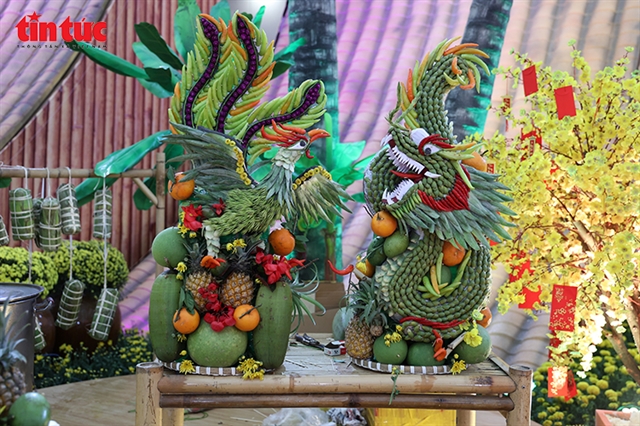 Under Tuyến's skilled hands, gourds, pumpkins, watermelons and mangoes transform into vivid representations of dragons, tigers, cranes and other familiar folk symbols. The natural colours of the produce, from the green of the leaves and the red of the dragon fruit to the yellow of the pomelo, are harmoniously arranged to create an eye-catching overall effect while maintaining a sense of familiarity.