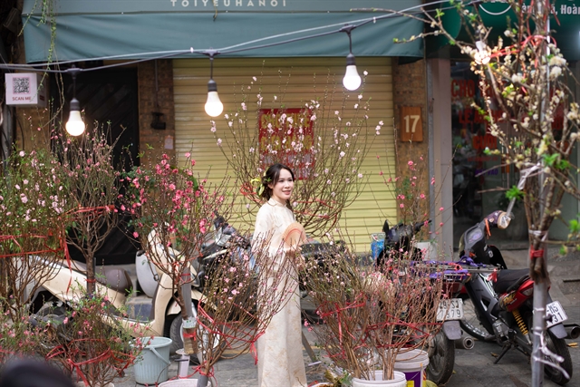 | A young woman in a traditional ‘áo dài’ poses for commemorative photos. The nostalgic atmosphere of Hàng Lược always draws Hanoi’s youth whenever spring arrives. VNS Photo Bảo Long |