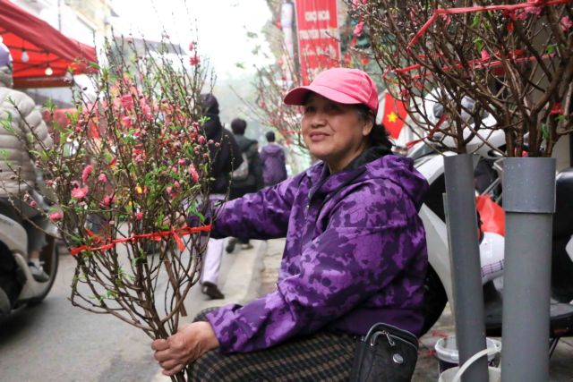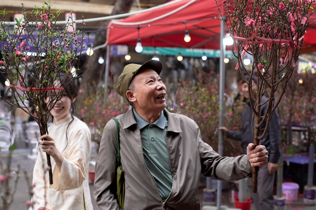 | Phạm Văn Xuân smiles after selecting a peach blossom branch at Hàng Lược Flower Market. For many elderly Hanoians, visiting the market is an unmissable cultural ritual to relive the spirit of old Tết. Xuân travelled nearly 30 kilometres from Kim Bôi and bought the branch after spotting it by chance. VNS Photo Bảo Long |