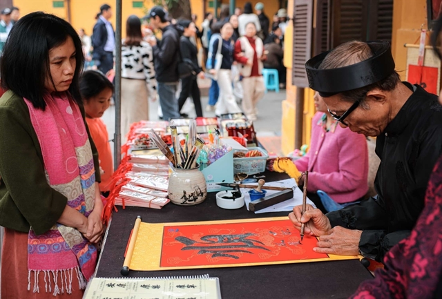 | Visitors ask for calligraphy at the beginning of the new year within the Hồ Chí Minh relic site. |