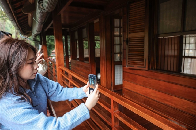 | People capture memorable moments during their visit to the stilt house in the Hồ Chí Minh relic complex. |