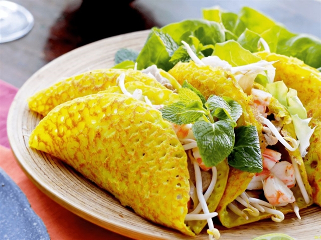 The US-based outlet described it: "Turmeric powder, not eggs, lends this iconic southern dish its yellow colour. Bánh xèo is named for the sizzling sound its batter makes on the skillet. It’s made like a pancake and served like a crepe, if pancakes and crepes were filled with pork, shrimp and bean sprouts. Dipped in fish sauce, there are also variants of bánh xèo in Thailand and Cambodia."