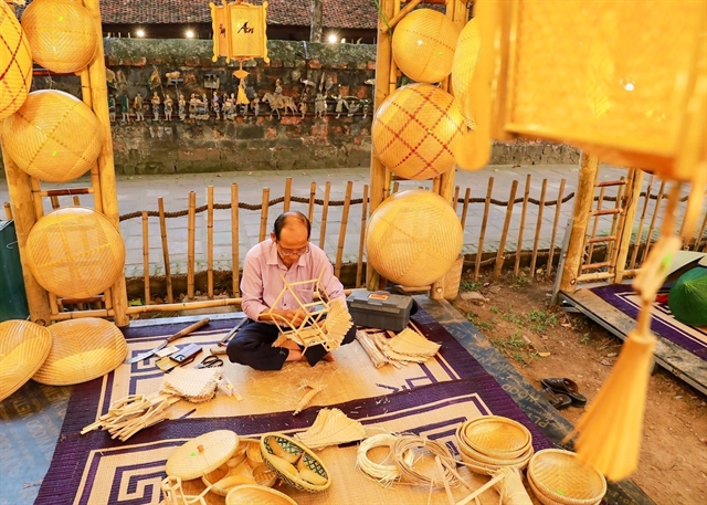 One of the participating artisans, Nguyễn Phương Quang from Phú craft village in Hà Nội, brings to the event a number of lantern types made from rattan and bamboo – traditional materials of the village, in addition to new ones elaborately crafted from papaya stems.