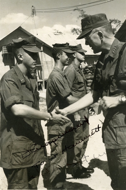 | Ted Hammett (left) in Việt Nam in 1968 with the Commandant of the US Marine Corps, who had asked to meet Marine officers whose fathers had been Marine officers. — Photo courtesy of Ted Hammett |