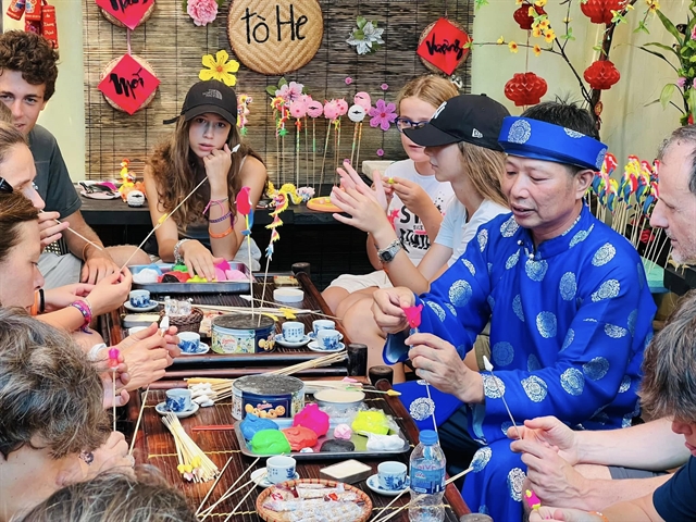 | Foreign tourists immerse themselves in learning Việt Nam’s age-old tò he craft. — Photo courtesy of Làng Tò He |